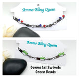 The bracelets are made with real fishing tackle supplies, snap swivels in two tone brass and silver or plain silver with a variety of colored glass beads. The bracelet has a Stainless Steel lobster clasp for easy on and off. The bracelets are approximately 8 inches but adjustable by just removing a swivel.